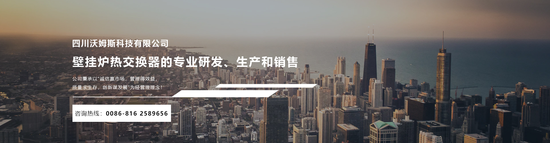 四川沃姆斯科技有限公司座落于環境優美的中國科技城----四川省綿陽市。 公司成立于2006年,是一家從事壁掛爐熱交換器的專業研發、生產和銷售的生產廠家。經過9年發展,匯集了一批擁有行業領先技術和豐富應用經驗的優秀人才?,F代化的生產設備,先進的生產技術工藝及各種精密的檢測設備,我們擁有年產量高達100萬臺的生產能力,能急客戶之所急,想客戶之所想,在市場中贏得客戶的一致認可。 公司秉承以“誠信贏市場,管理得效益,質量求生存,創新謀發展”為經營理理念!憑借高質量的產品,完善的售后服務,良好的信譽,贏得市場! ...